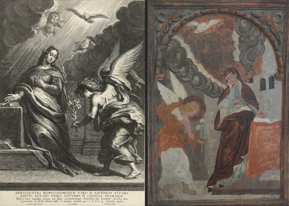 {"id":30,"form_id":2,"category":"category-1","name":"10.jpg","path":"images\/bridges\/10.jpg","url":"https:\/\/bridges.polyuni-frankfurt.de\/images\/bridges\/10.jpg","thumbnail_url":"\/images\/bagallery\/gallery-2\/thumbnail\/category-1\/10.jpg","title":"The Annunciation","short":"","alt":"","description":"<h1>The Annunciation<\/h1>\n\n<hr \/>\n<p><span style=\"font-size:12pt\"><span style=\"line-height:115%\"><span style=\"font-family:Aptos,sans-serif\"><span lang=\"EN-US\" style=\"font-family:"Cambria",serif\">Beginning in the sixteenth century, powerful Western influences, which had previously been marginal, entered the cultural landscape, most notably through Flemish and German engravings—these left a lasting mark on local artistic traditions. By the late seventeenth century, many Ukrainian icons had shifted from the stillness of the Byzantine image to the <b>dynamic movement, depth, and emotion<\/b> found in Western art.<\/span><\/span><\/span><\/span><\/p>\n\n<p style=\"text-align:justify; margin-bottom:11px\"><span style=\"font-size:12pt\"><span style=\"line-height:115%\"><span style=\"font-family:Aptos,sans-serif\"><span lang=\"EN-US\" style=\"font-family:"Cambria",serif\">A Ukrainian icon of the Annunciation might now show Gabriel bowing in courtly reverence, a lily in hand<\/span> <span lang=\"EN-US\" style=\"font-family:"Cambria",serif\">motif—lifted straight from a print by Antwerp engraver Schelte Bolswert (ca. 1586–1659).<\/span><\/span><\/span><\/span><\/p>\n\n<p style=\"text-align:justify; margin-bottom:11px\"><span style=\"font-size:12pt\"><span style=\"line-height:115%\"><span style=\"font-family:Aptos,sans-serif\"><span lang=\"EN-US\" style=\"font-family:"Cambria",serif\">Still, Ukrainian artists didn’t merely imitate. They kept essential elements of their own tradition, such as the Virgin’s characteristic robes—preserving identity within change.<\/span><\/span><\/span><\/span><\/p>\n\n<p>.<\/p>\n\n<p> <\/p>\n\n<h2>1. The Annunciation<\/h2>\n\n<p>Schelte Adamsz. Bolswert, after Gerard Seghers<br data-end=\"120\" data-start=\"117\" \/>\nEngraving, early 17th century<br data-end=\"152\" data-start=\"149\" \/>\n38.5 × 27.1 cm<\/p>\n\n<p>Flemish school — Museum Plantin-Moretus (Printroom collection), UNESCO World Heritage, Antwerp<\/p>\n\n<h2>2. The Annunciation<\/h2>\n\n<p>Unknown artist<br \/>\nIcon, tempera on wood, late 17th – early 18th century<br \/>\n121.3 × 86.5 cm<br \/>\nWestern Ukraine — City Museum "Spiritual Treasures of Ukraine", Kyiv<\/p>\n","link":"","video":"","settings":null,"likes":0,"imageId":"9","target":"blank","lightboxUrl":"the-annunciation","watermark_name":"10.jpg","hideInAll":0,"suffix":"round "}